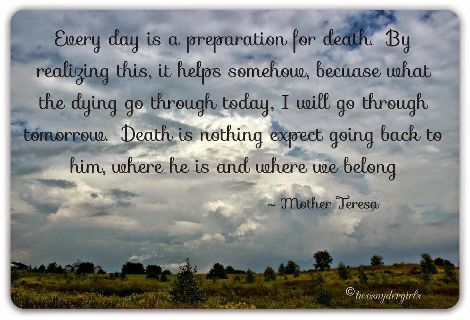 Everyday is a preparation for death. By realizing this, it helps somehow, because what the dying to through today, I will go through tomorrow. Death is nothing expect going back to him, where he is and where we belong ~ Mother Teresa