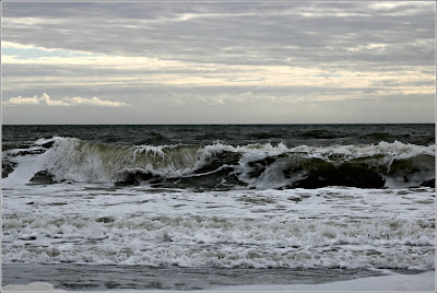 Warm weather arrived this morning and the sun disappeared. We attempted to walk the beach to find high tide had arrived and the waves strong and rough.